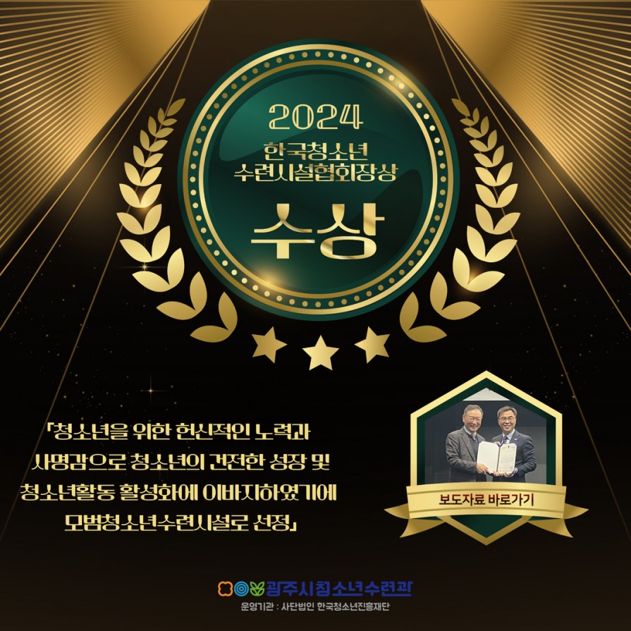 해당 표창은 청소년활동 활성화와 건전 육성에 기여한 공로가 있는 청소년수련시설을 표창함으로써 청소년수련시설의 운영 발전 및 청소년지도자의 사기 증진을 도모하기 위해 마련되었으며, 광주시 청소년수련관은 지난 2022년 12월 청소년활동 진흥 유공으로 경기도지사상을 수상한 것에 이어 수상의 영광을 안았다.